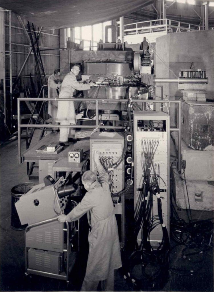 The Lawrence Lab was founded in 1931 by Berkeley professor Ernest Lawrence, the physicist responsible for the invention of the cyclotron. In the late 1920s, seeking to build a compact particle accelerator for use in high-energy physics, Lawrence devised a circular chamber that used electromagnetic fields for confinement. The ‘cyclotron’ took advantage of its circular design, in which particles cross the accelerating field repeatedly, to maximize the energy output. Lawrence would later win a Nobel Prize in Physics for the invention.